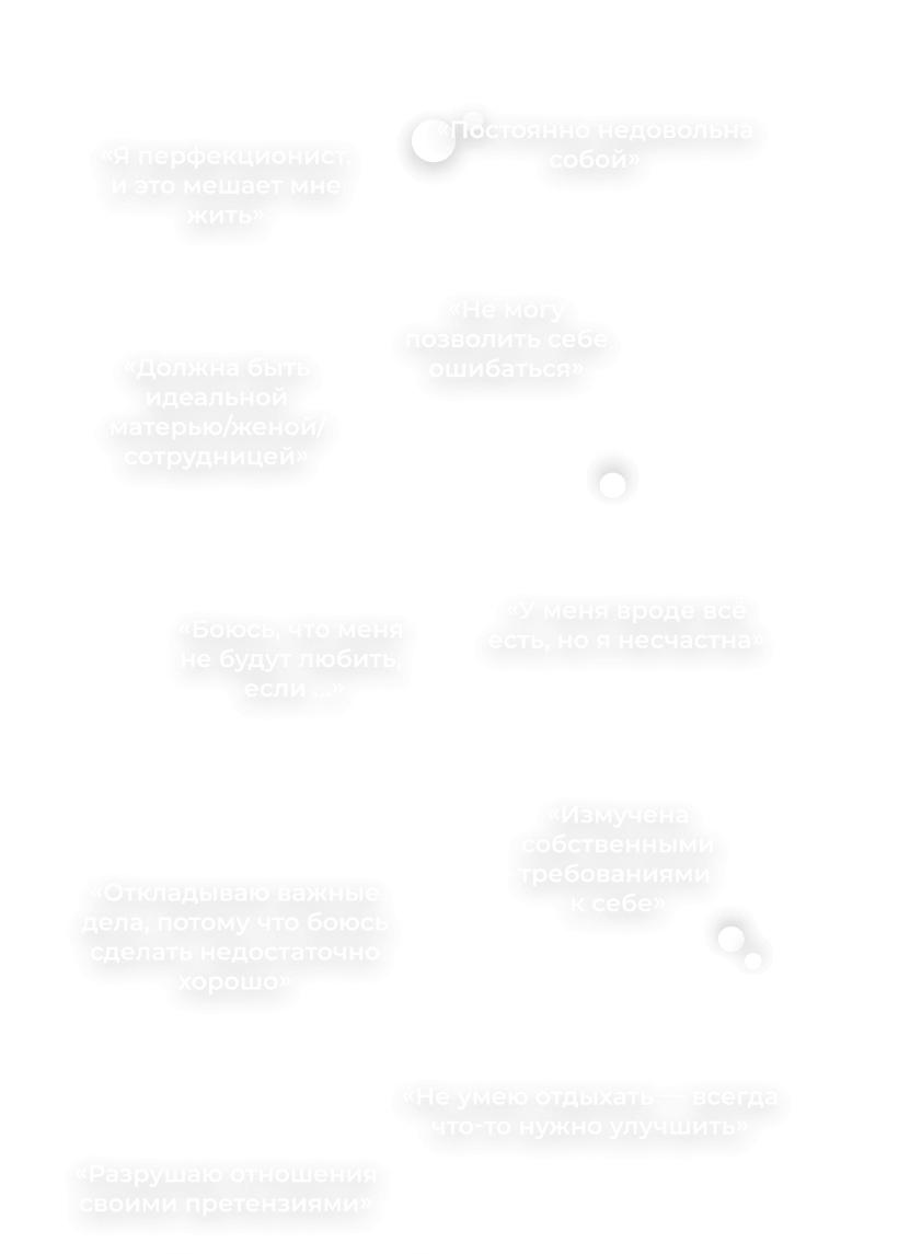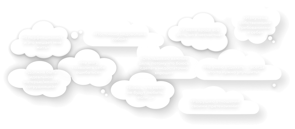 Клиенты с этим запросом часто достигают внешнего успеха, но при этом страдают от хронической неудовлетворённости, тревоги, неспособности радоваться достижениям. Они живут в постоянном напряжении между тем, «какими должны быть» и тем, «какие есть на самом деле».
