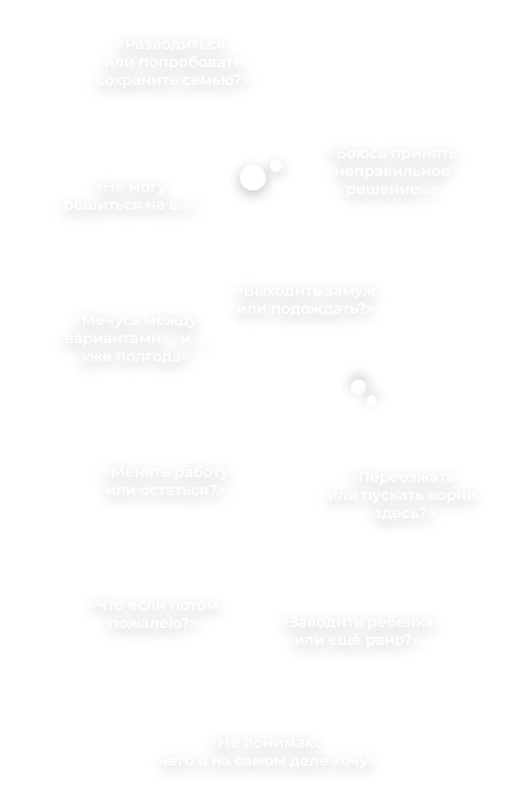 Клиенты боятся ошибиться, упустить возможность, взять ответственность за своё решение и его последствия... — это нормально, особенно, в современном мире, где нет чётких опор и ориентиров. Поэтому люди месяцами мучаются вопросами о браке, разводе, смене работы, переезде, рождении детей — и не могут сдвинуться с мёртвой точки.