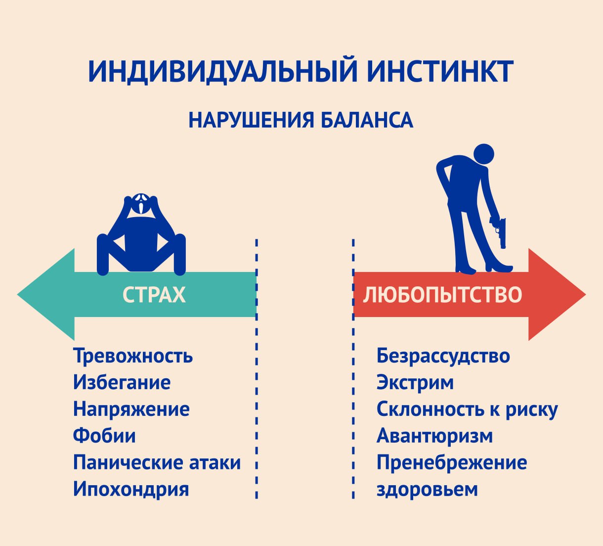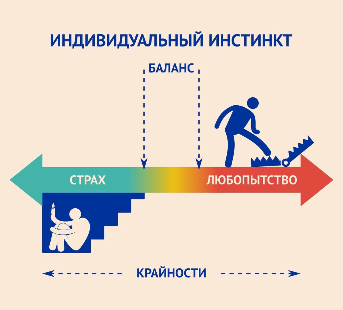 Индивидуальный инстинкт самосохранения имеет бинарную структуру — состоит из двух противоположных импульсов. С одной стороны, это страх — стремление избежать опасности, уйти от угрозы, сохранить «статус-кво». С другой — любопытство, толкающее нас исследовать мир, пробовать новое, расширять границы известного.