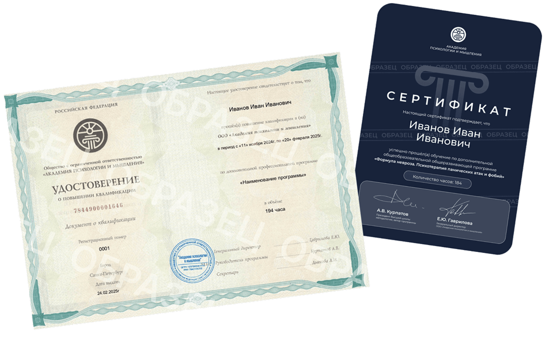 Вы также можете продолжить обучение в Академии психологии и мышления на следующих уровнях и получить в результате диплом о профессиональной переподготовке.