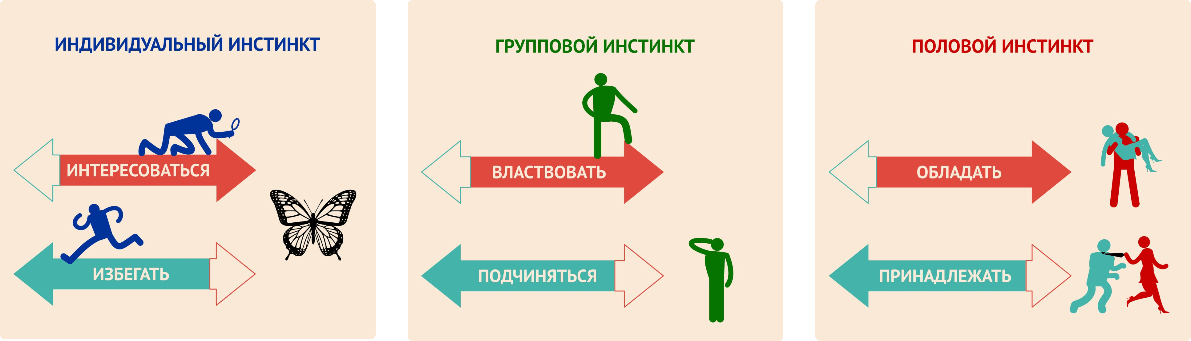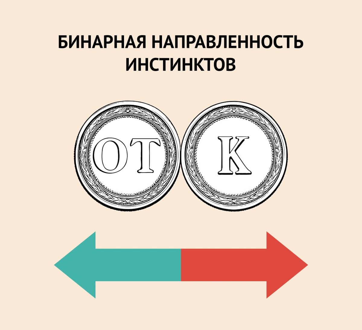 И каждый из трёх инстинктов имеет свою бинарную структуру — две направленности, которые создают внутреннее напряжение и динамику: