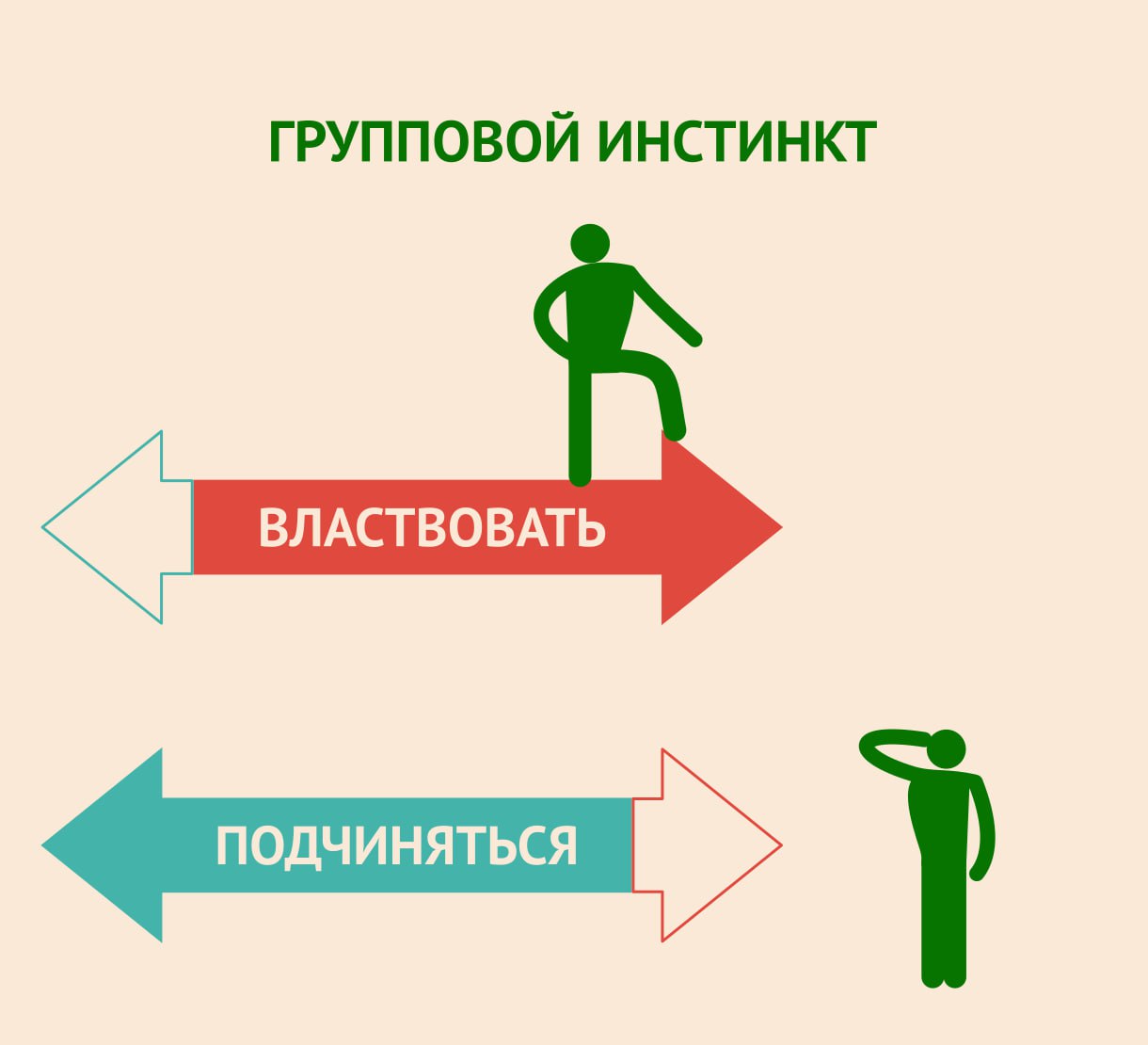 групповой инстинкт проявляется в желании быть «над» (властвовать, лидировать, контролировать) и потребности быть «под» (получать защиту, заботу, руководство): мы хотим и доминировать, и принадлежать — эта двойственность создаёт всю сложность социальных иерархий;