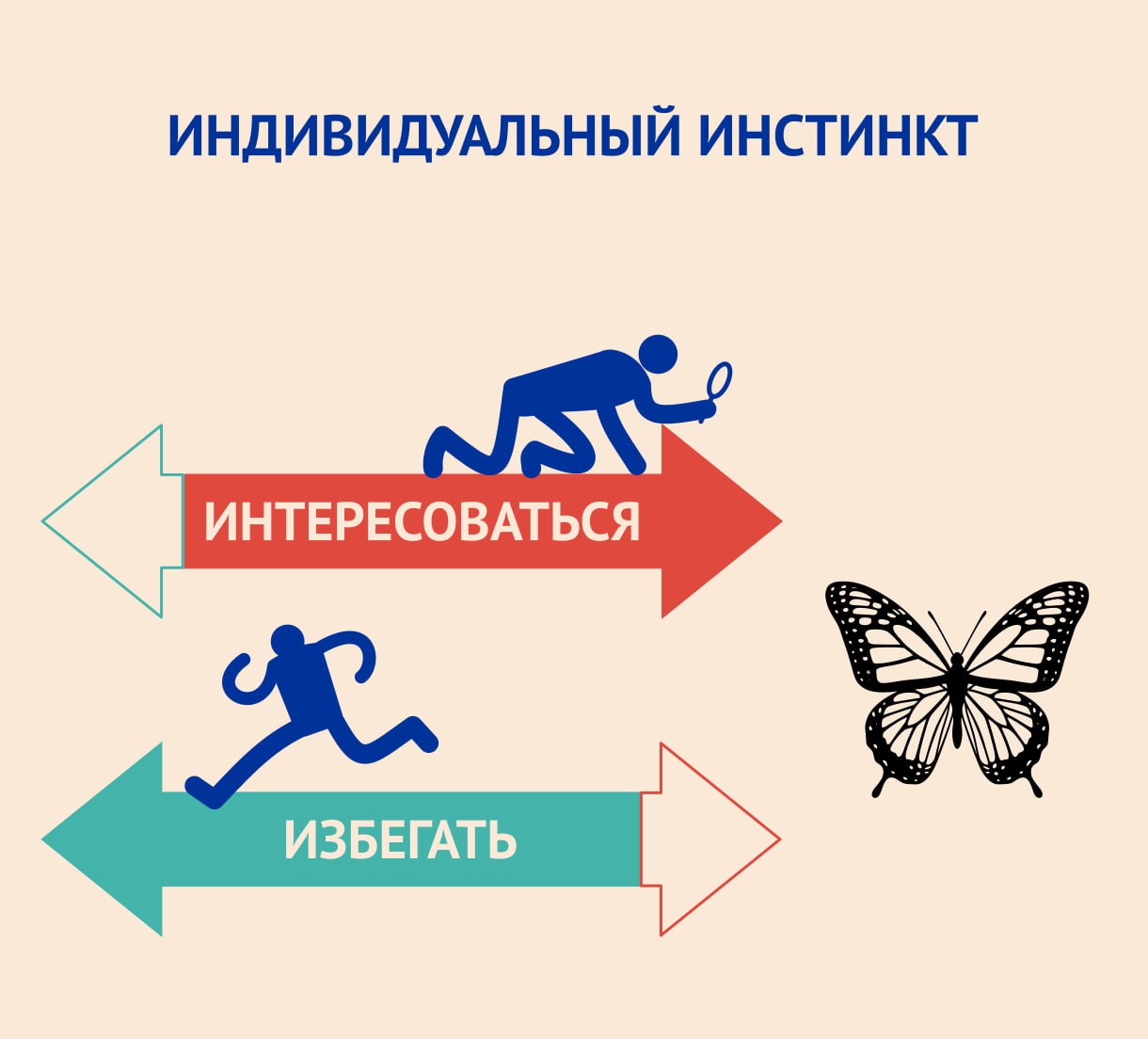 индивидуальный инстинкт раскрывается через страх (направленность «от» опасности) и любопытство (направленность «к» новому): мы одновременно избегаем угроз и исследуем мир — именно это сочетание позволяет выживать, не превращаясь ни в параноика, ни в безрассудного смельчака;