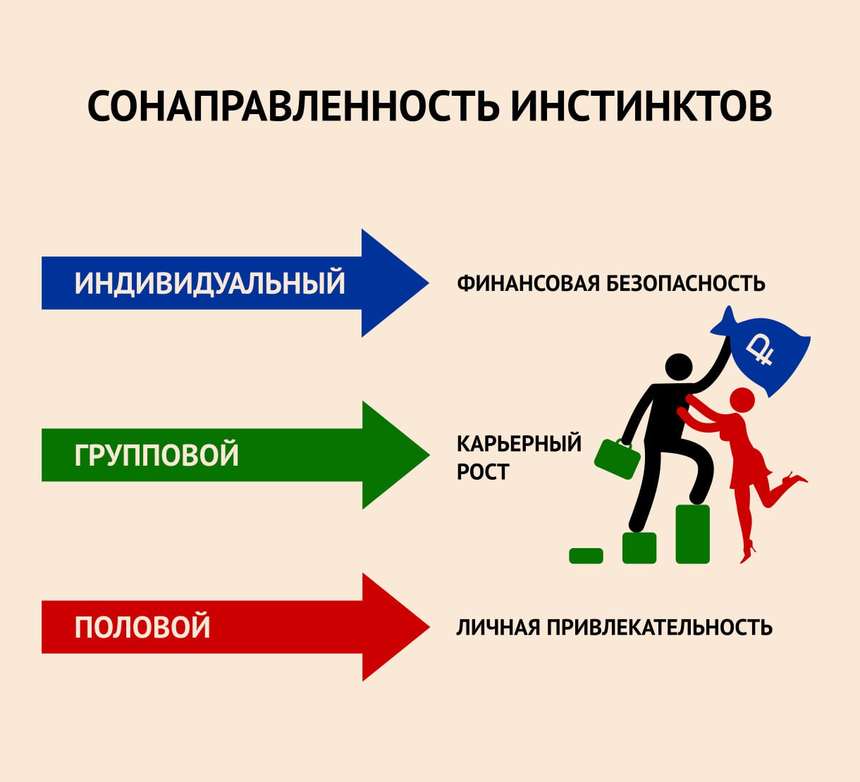 Три компонента тенденции выживания работают как единая система. Иногда они усиливают друг друга: успех в карьере (иерархический инстинкт) обеспечивает финансовую безопасность (индивидуальный) и делает нас привлекательнее для партнёров (половой).