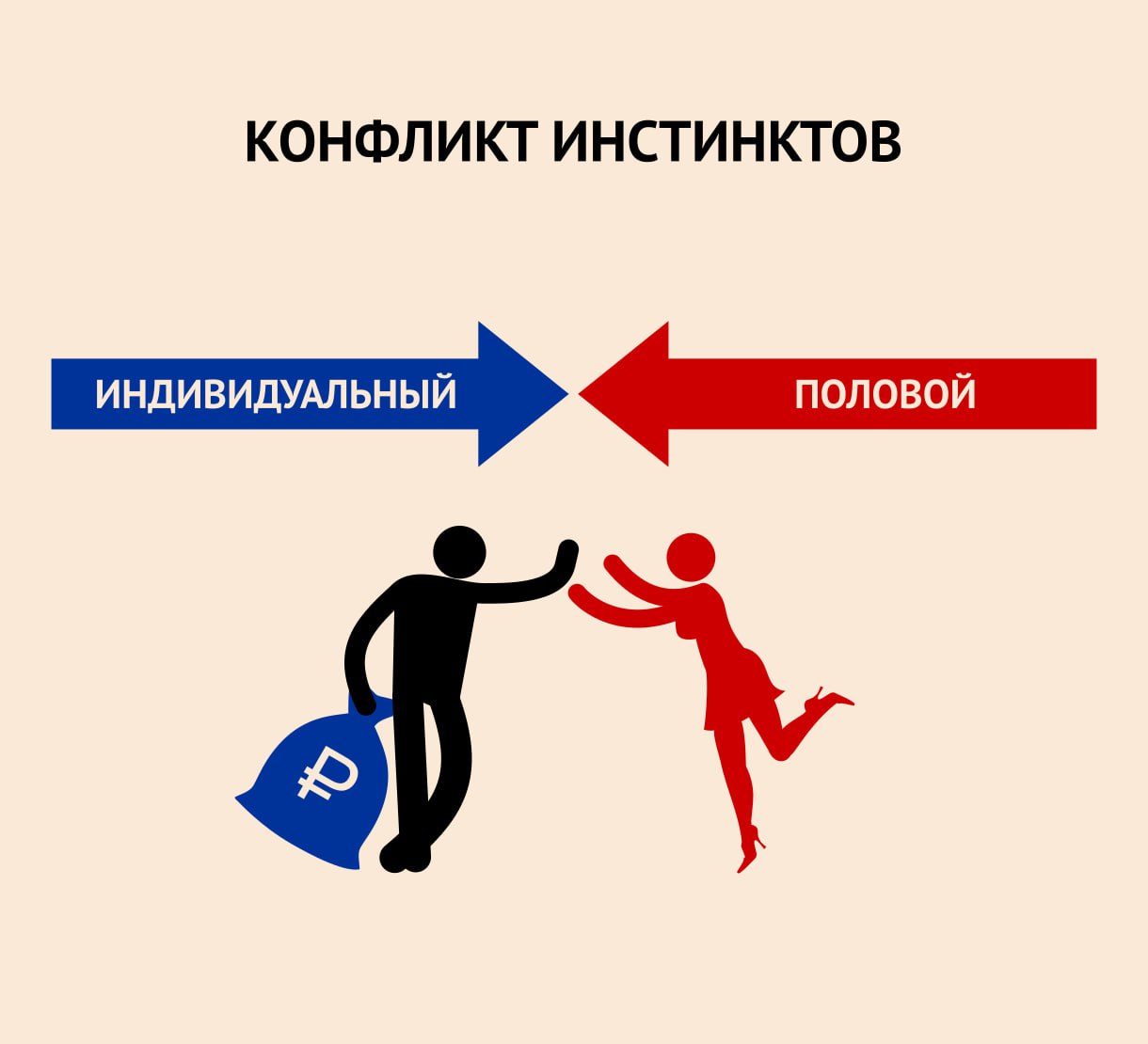 Но часто они вступают в конфликт. Желание близости (половой инстинкт) может противоречить потребности в безопасности (индивидуальный) — отсюда страх отношений (основанный, например, на прошлом негативном опыте). Стремление к высокому статусу (иерархический) может требовать риска и выхода из зоны комфорта (против инстинкта безопасности).