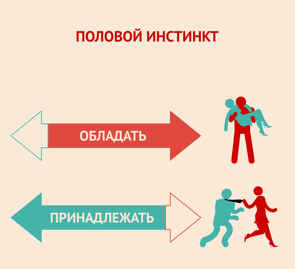 половой инстинкт выражается в стремлении обладать (вызывать восхищение, притягивать, завоёвывать) и желании принадлежать (восхищаться, отдаваться, растворяться в другом): мы одновременно хотим быть объектом желания и сами испытывать это желание.